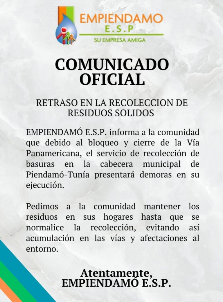 EMPIENDAMÓ E.S.P. informa a la comunidad que debido al bloqueo y cierre de la Vía Panamericana, el servicio de recolección de basuras en la cabecera municipal de Piendamó-Tunía presentará demoras en su ejecución