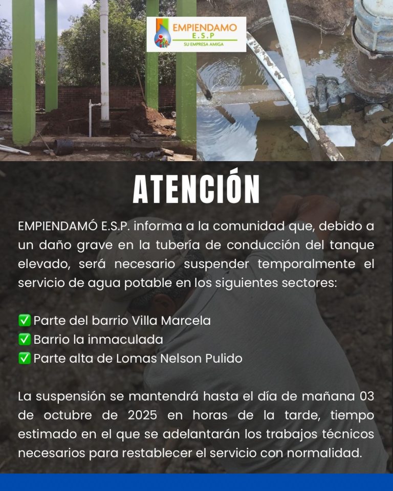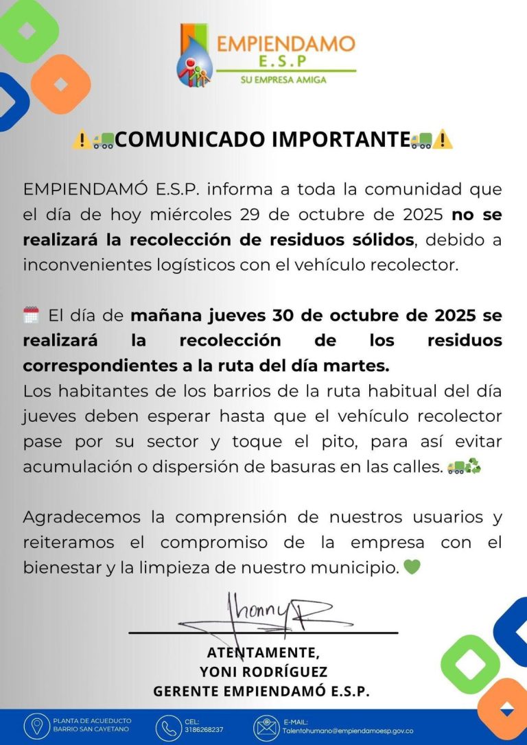 EMPIENDAMÓ E.S.P. informa a toda la comunidad que el día de hoy miércoles 29 de octubre de 2025 no se realizará la recolección de residuos sólidos, debido a inconvenientes logísticos con el vehículo recolector.